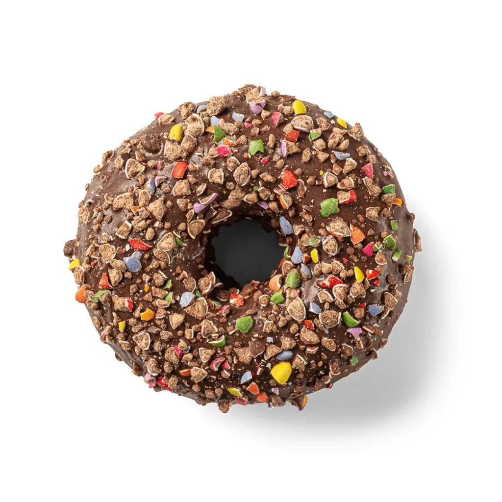 A festive donut packed with rainbow sprinkles, soft vanilla flavor, and a fun, celebratory sweetness in every colorful bite.