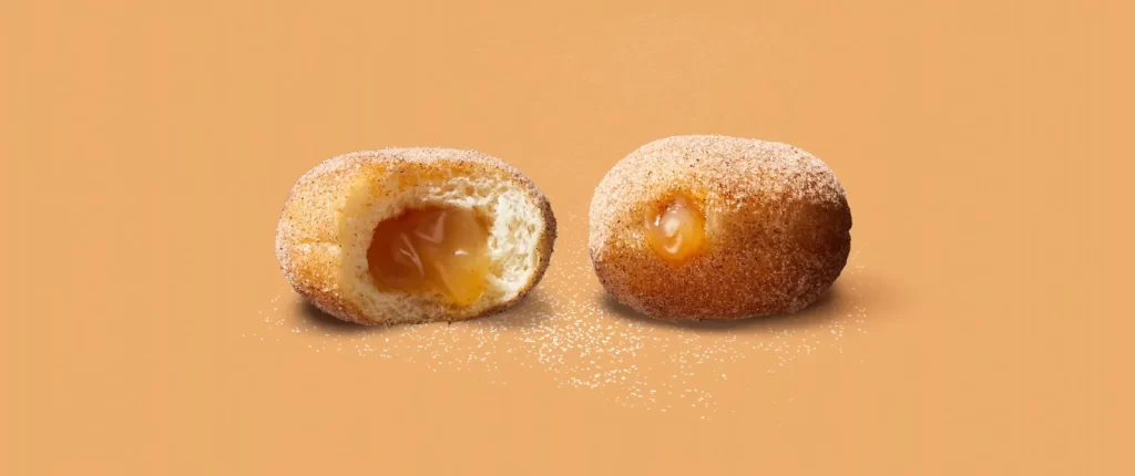 A warm, glazed donut filled with smooth apple-cinnamon goodness, inspired by classic flavors with a comforting, fruity twist.